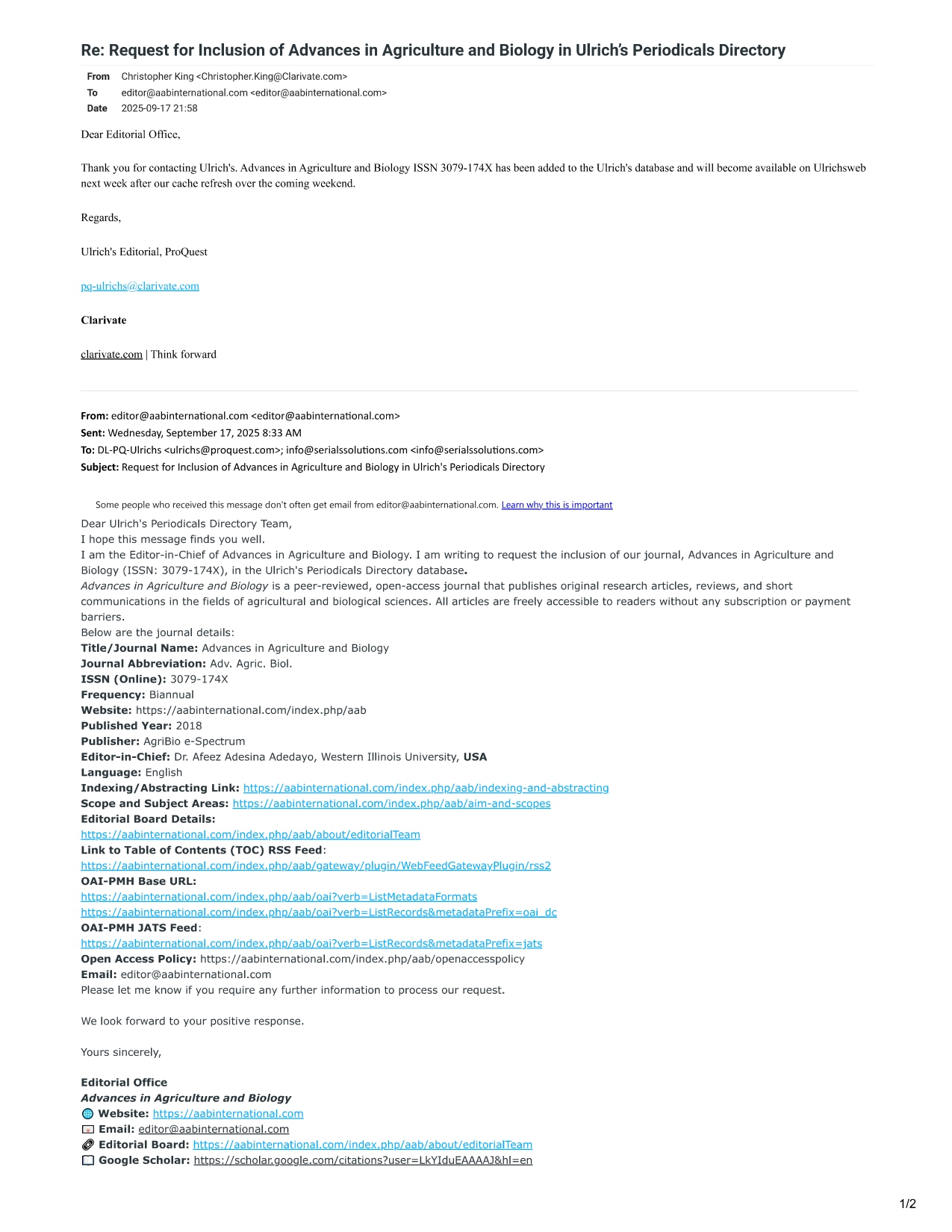 Advances in Agriculture and Biology (ISSN: 3079-174X) is currently being covered by the following services: